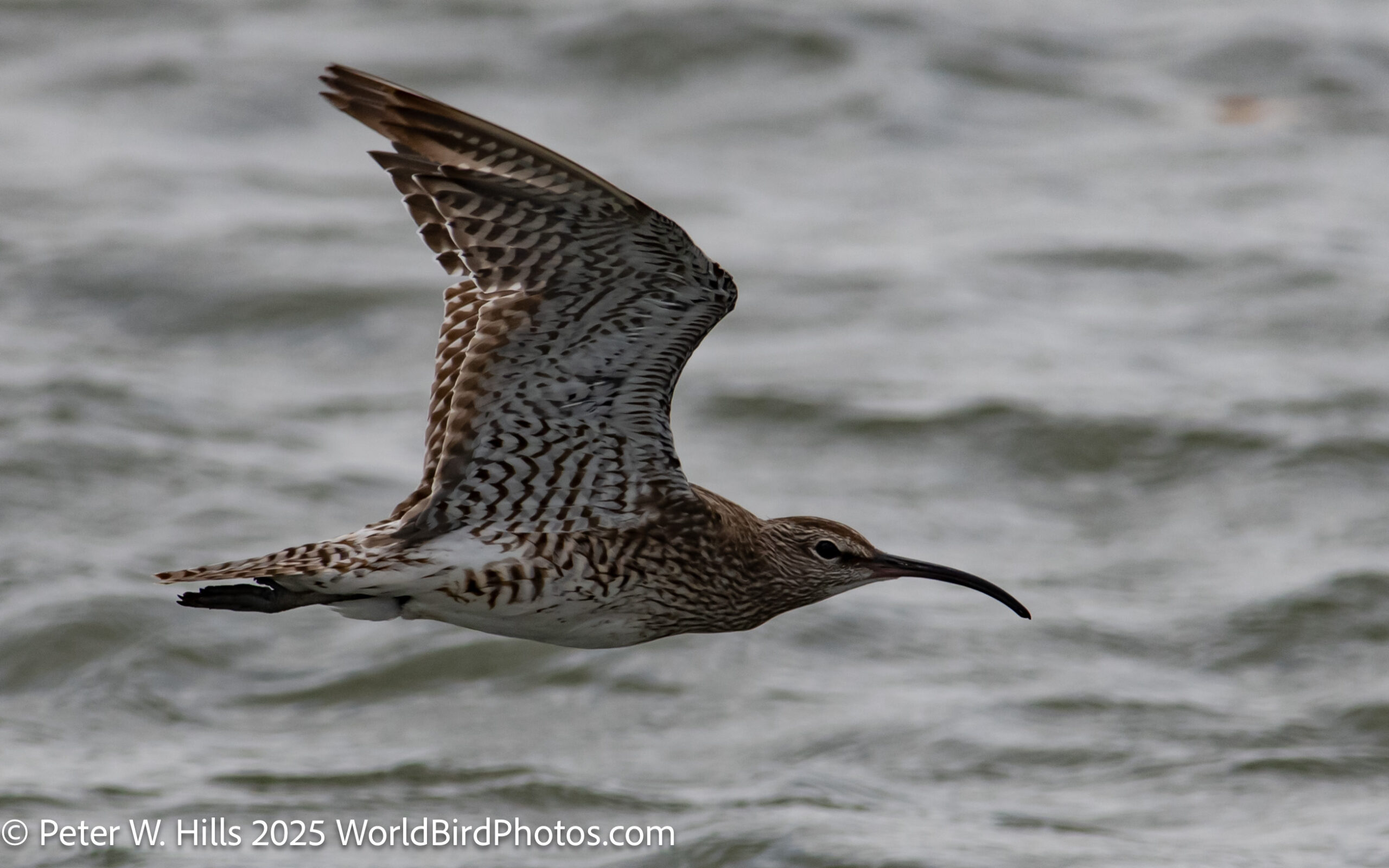 Whimbrel Eurasian (Numenius phaeopus) in flight – Coastal, Banjul, Gambia